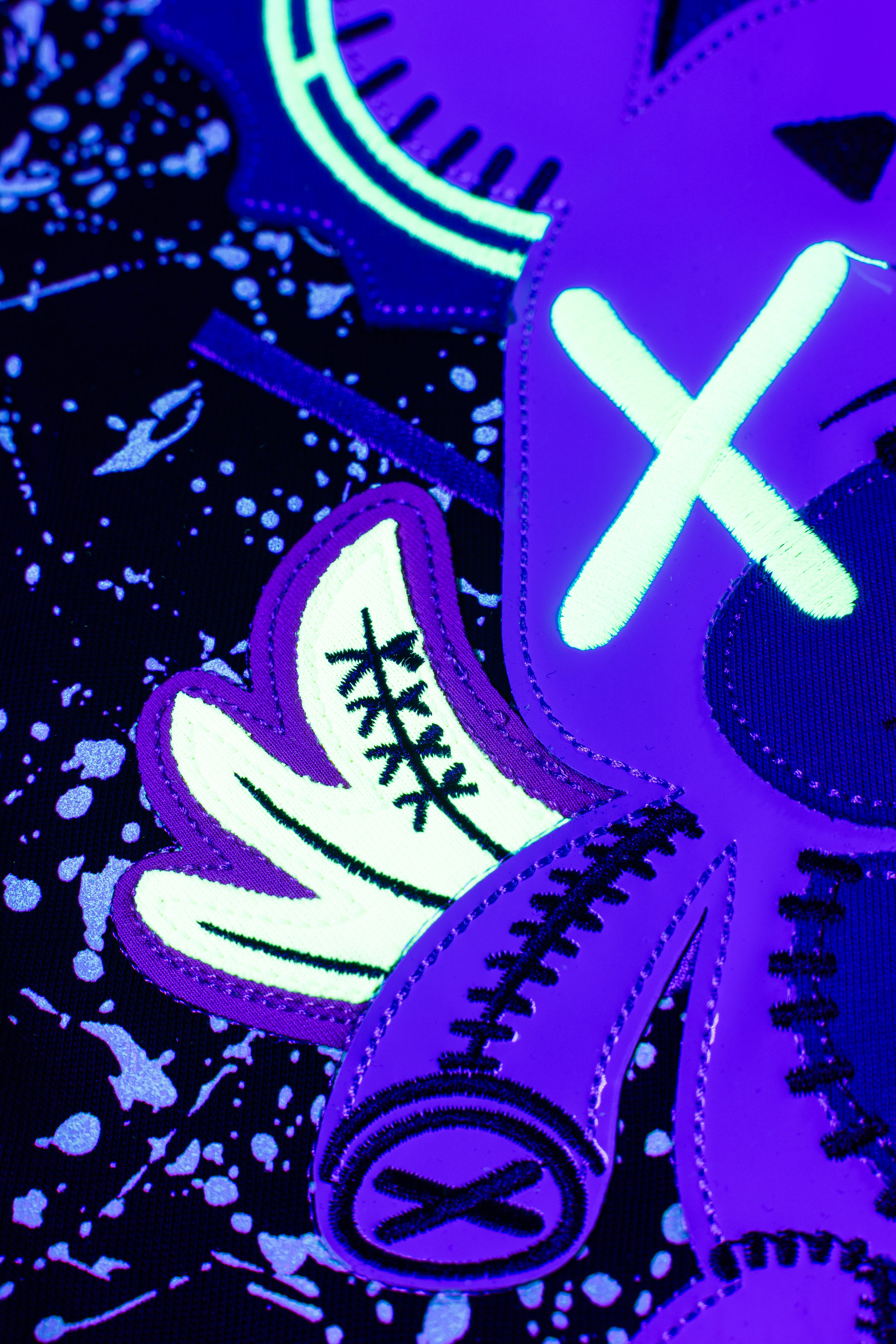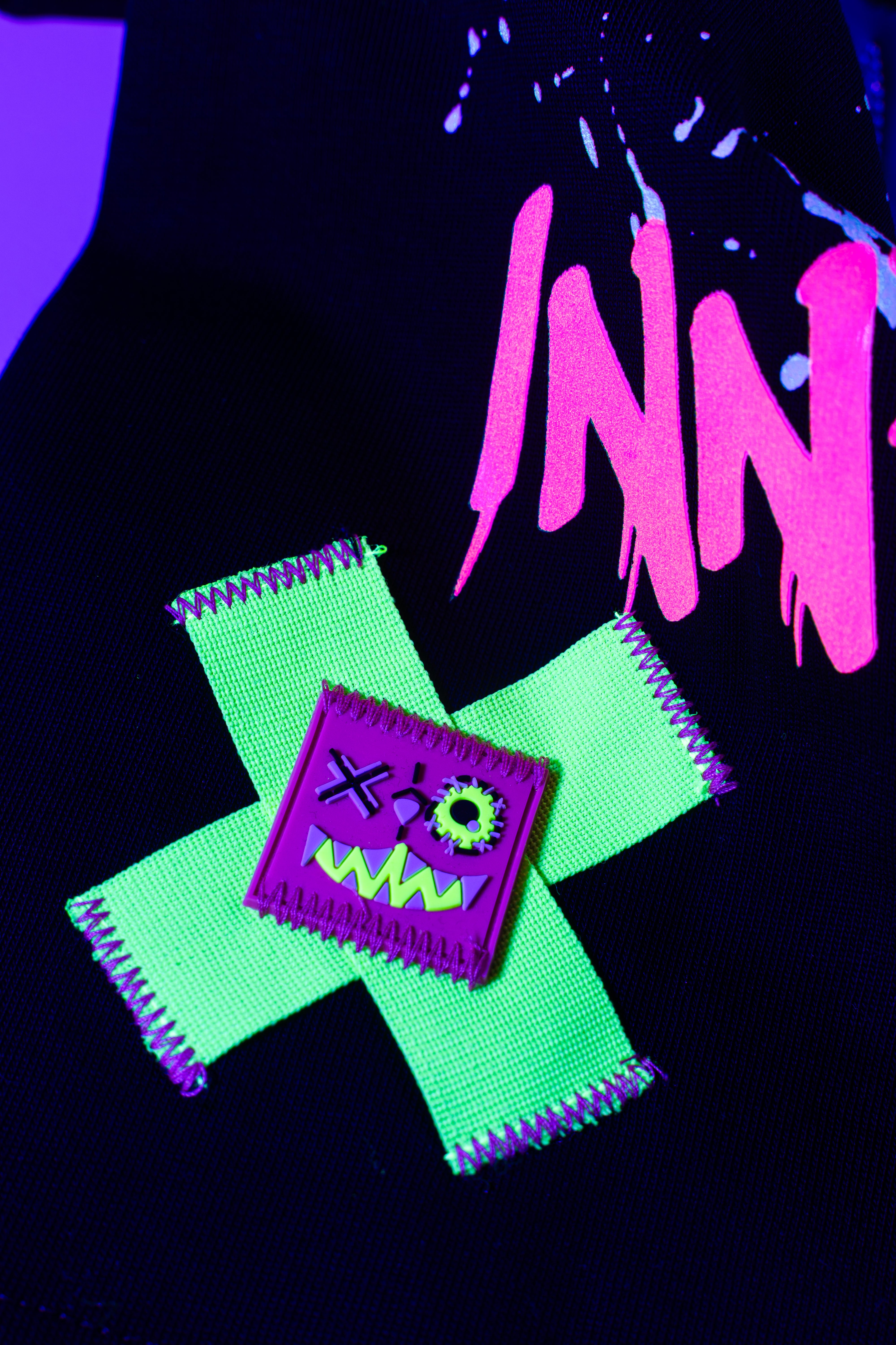 This oversized black t-shirt features a bold monster bear graphic with neon prints that react under UV light and glow in the dark. The front includes a small chest logo, while the back showcases a full-sized design with arrows and the phrase “WICK MONSTERS” in striking color. Made for those who want to stand out—day or night.