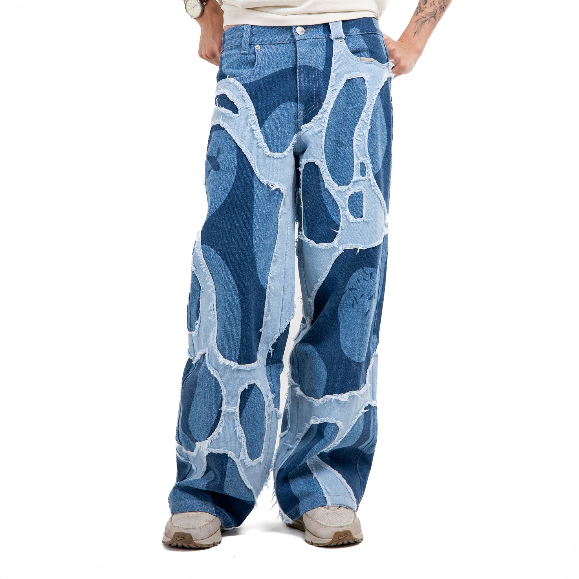 Tidal Pool Jeans feature a underwater aesthetic stone wash finish with silver metal hardware and a custom-embossed front button. Built with functional belt loops and dual-sided pockets.