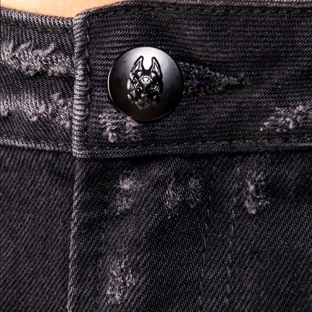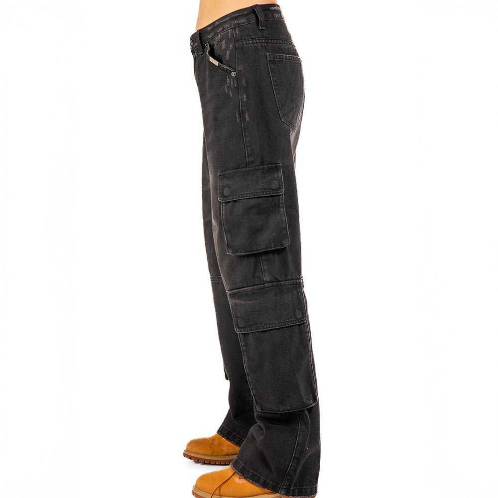 Distressed Cargo Denim with a baggy, over-ankle fit, crafted from 100% cotton denim in a natural black wash. Finished with custom metal rivets and button.