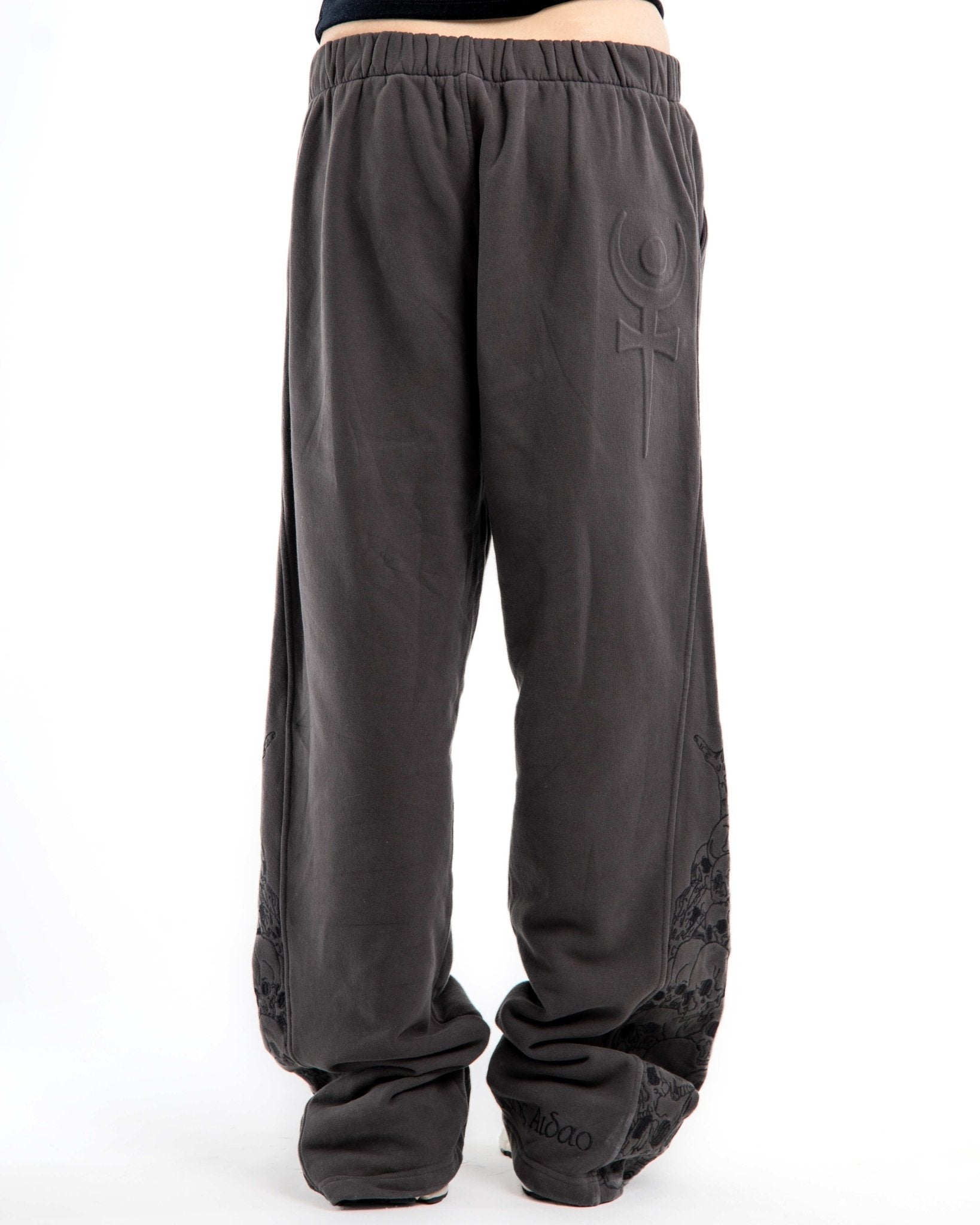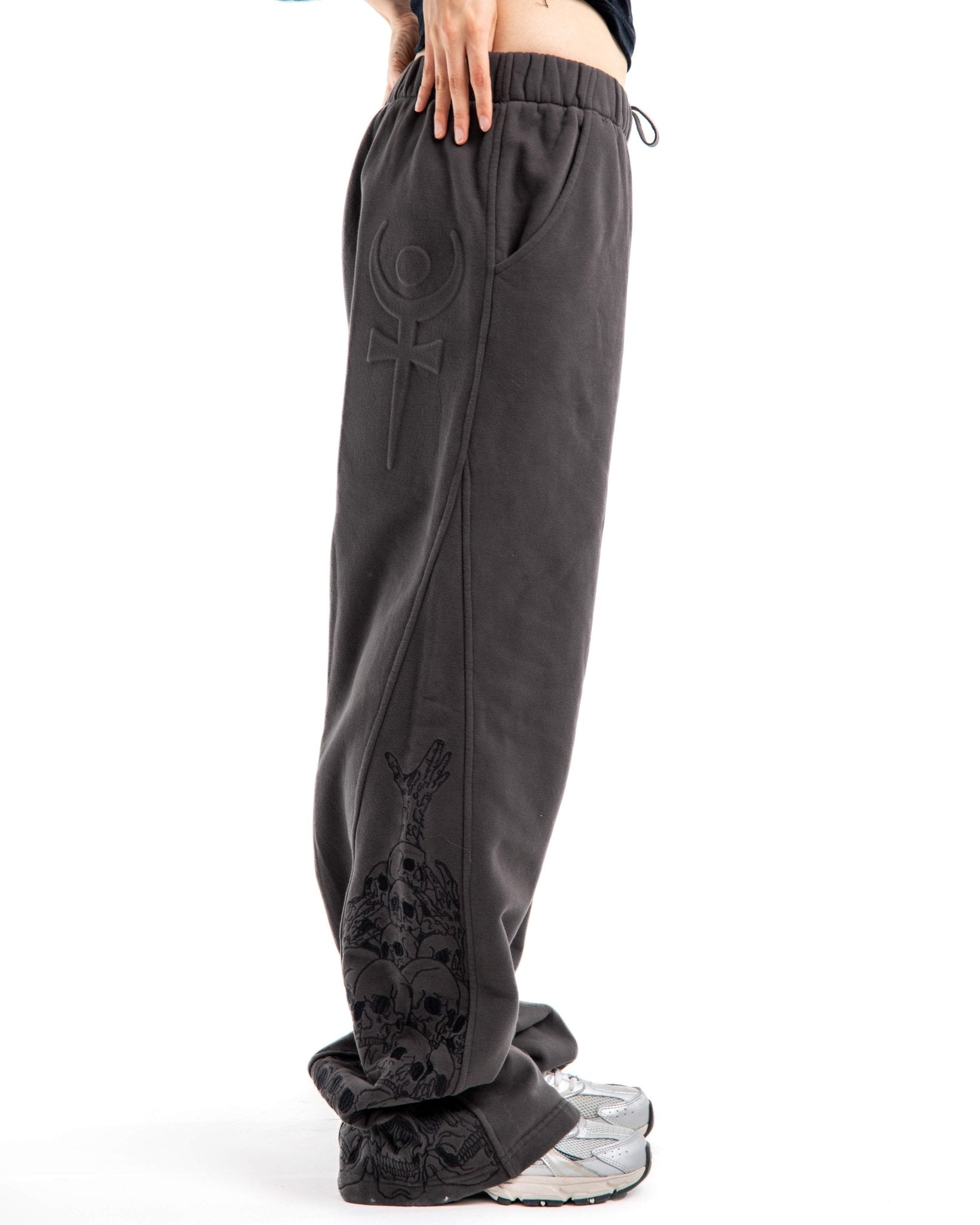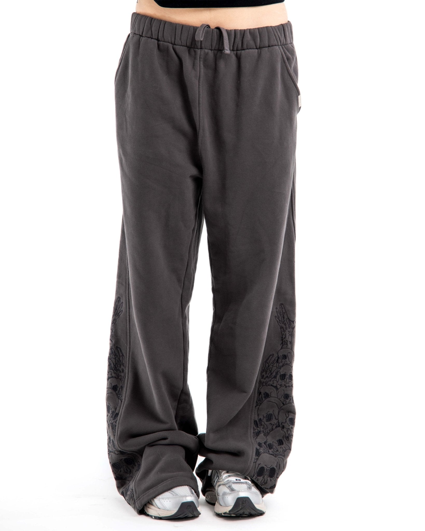 House of Hades Joggers with an oversized, straight-leg fit, crafted from 100% cotton in charcoal grey. These sweatpants feature intricate embroidery along the inseams, inspired by the underworld with designs of stacked skulls and skeletal hands. A custom embossed Hades logo on the back pocket adds a bold finishing touch.