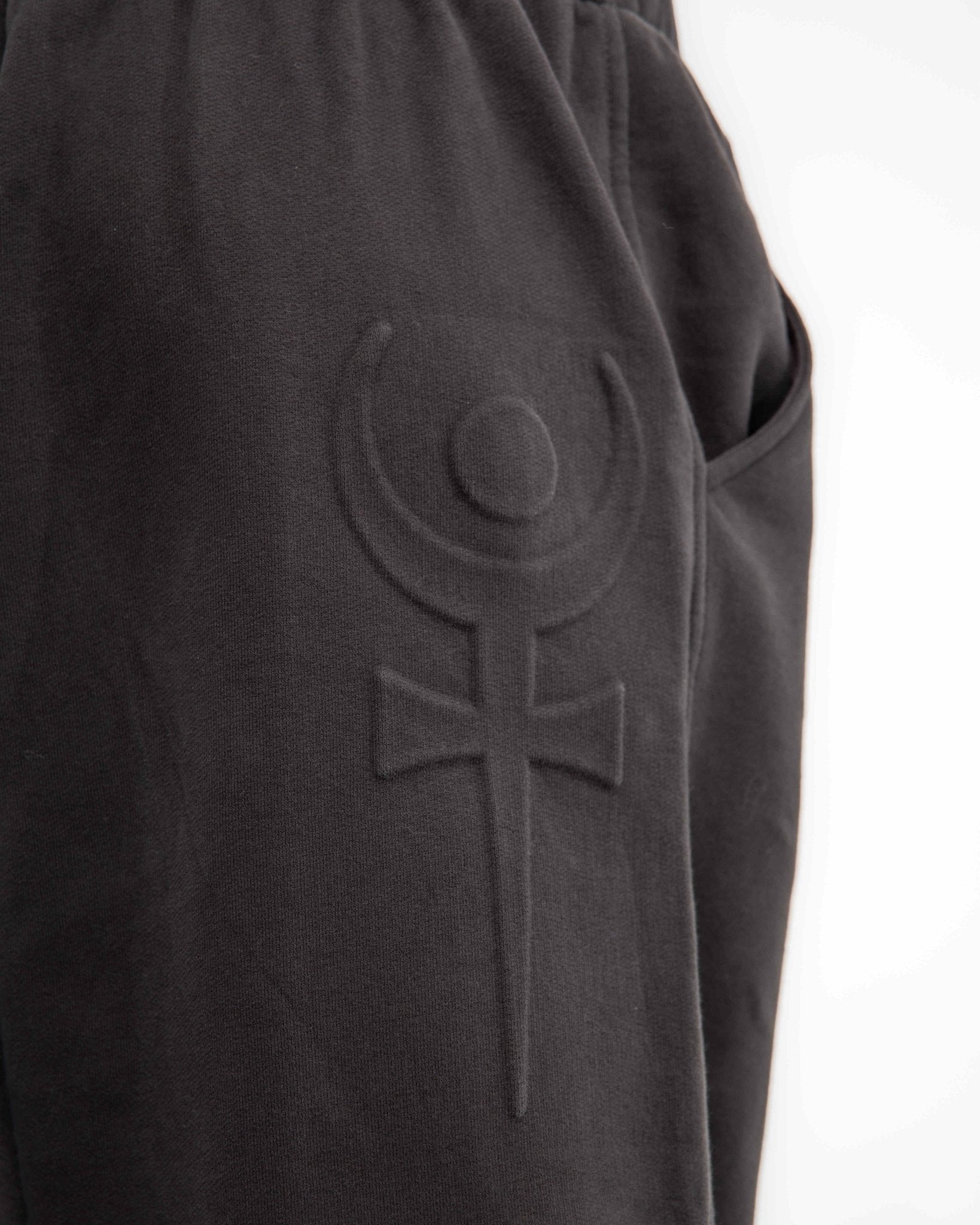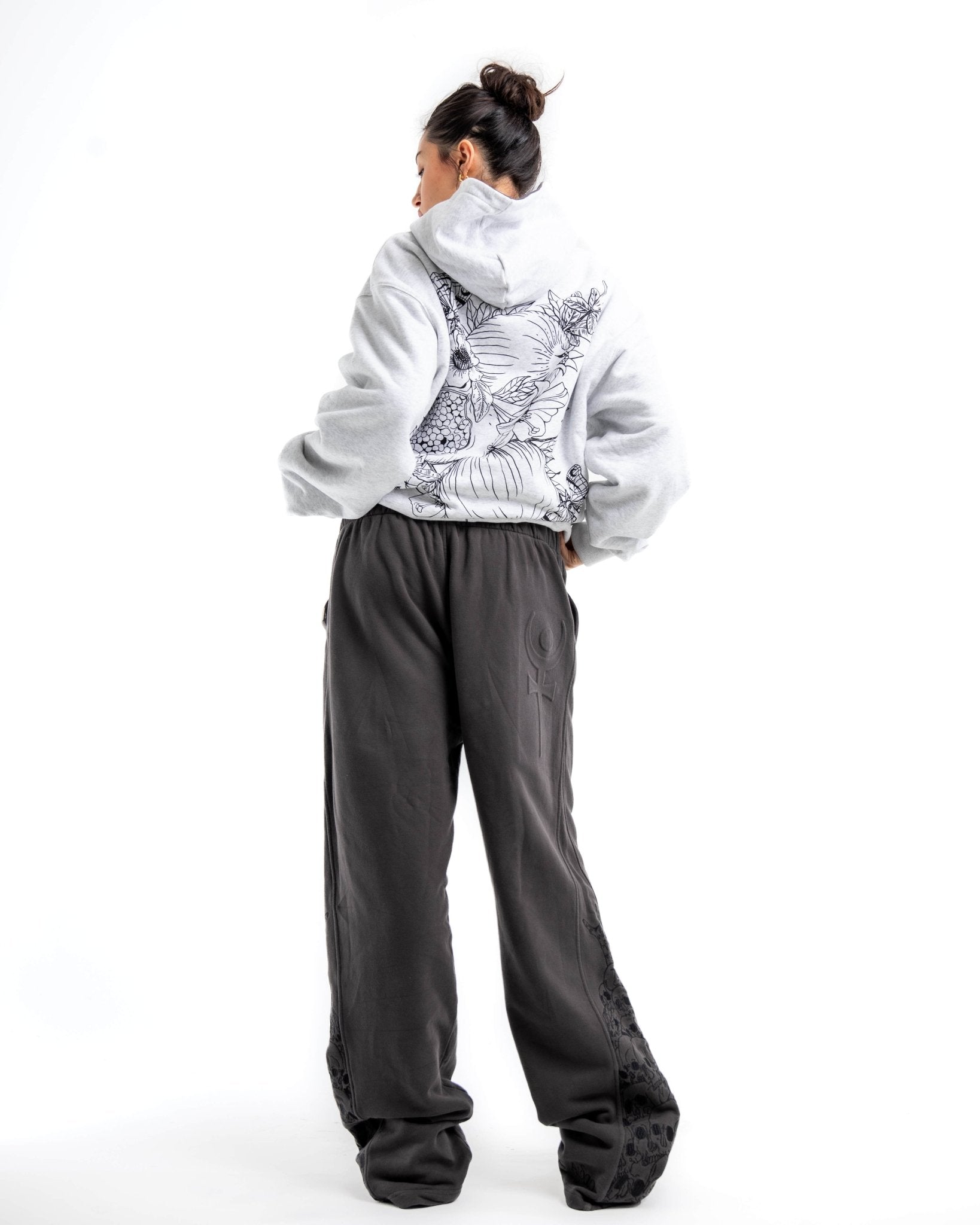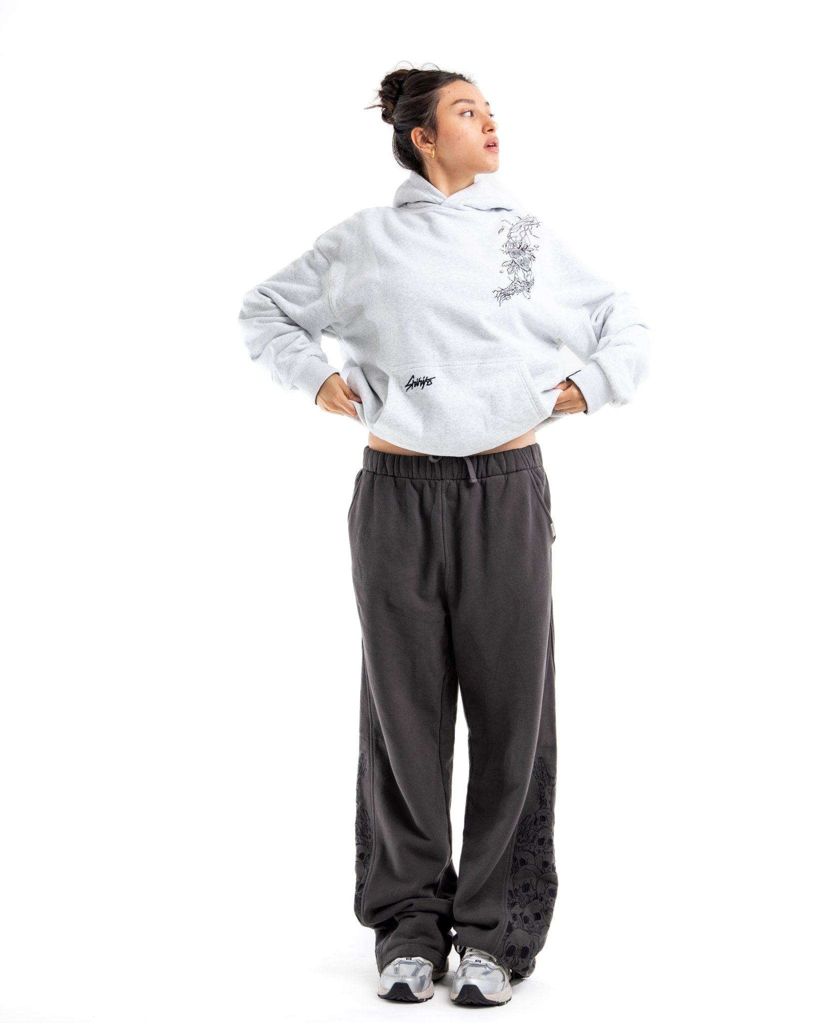 House of Hades Joggers with an oversized, straight-leg fit, crafted from 100% cotton in charcoal grey. These sweatpants feature intricate embroidery along the inseams, inspired by the underworld with designs of stacked skulls and skeletal hands. A custom embossed Hades logo on the back pocket adds a bold finishing touch.