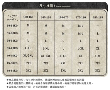 *若對於尺寸有任何疑慮,歡迎來訊提供 身高 / 體重 / 胸圍 供客服協助評估。