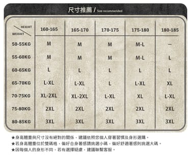 *若對於尺寸有任何疑慮,歡迎來訊提供 身高 / 體重 / 胸圍 / 腰圍 供客服協助評估。