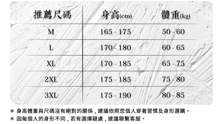 *若對於尺寸有任何疑慮,歡迎來訊提供 身高 / 體重 / 胸圍 / 腰圍 供客服協助評估。