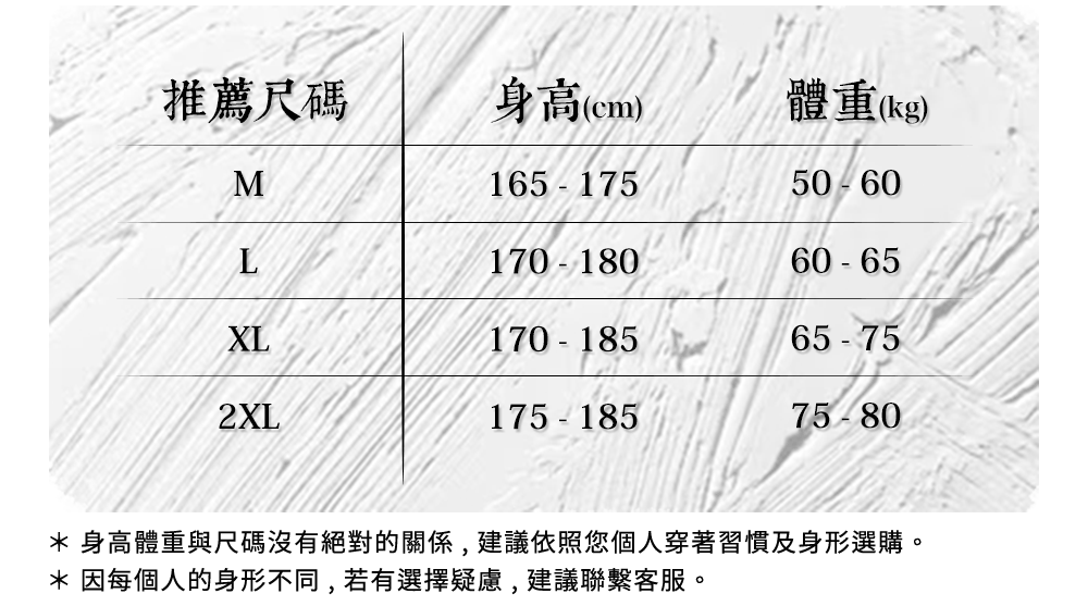 *若對於尺寸有任何疑慮,歡迎來訊提供 身高 / 體重 / 胸圍 / 腰圍 供客服協助評估。