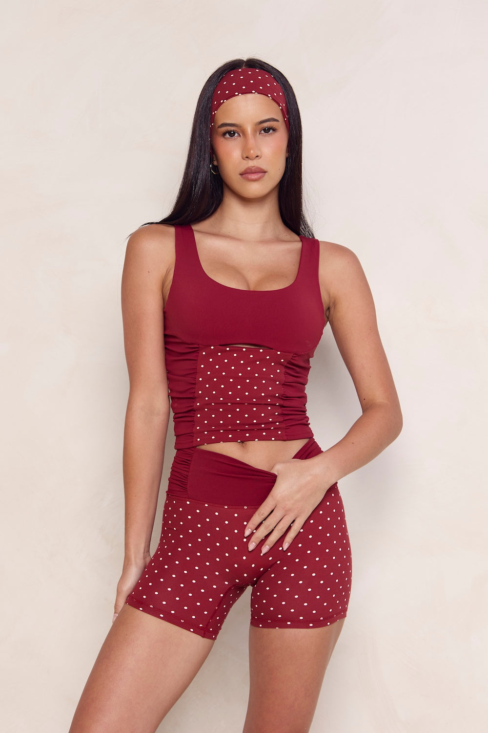 Our LUXE BALANCE Headband is the perfect pairing to your Merlot Polka set. Composed of our plush fabric and with an added non-slip detailing, it's designed to stay in place through any activity.