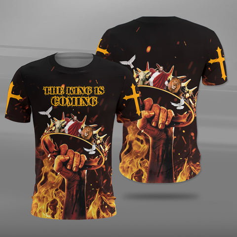This 3D all-over print t-shirt features an intricate design inspired by the popular film, Game of Thrones. The centerpiece of the design is a depiction of Jesus as the lion and the lamb, surrounded by a crown of thorns, symbolizing both his humility and his power. The combination of religious imagery and pop culture references creates a uniquely eye-catching design that is sure to turn heads. The phrase "The King Is Coming" adds to the sense of anticipation and drama conveyed by the design. This t-shirt is a must-have for fans of Game of Thrones and those who appreciate powerful and inspiring visuals. So, if you're a fashion-conscious fan looking for a unique addition to your wardrobe, this design is the perfect choice.