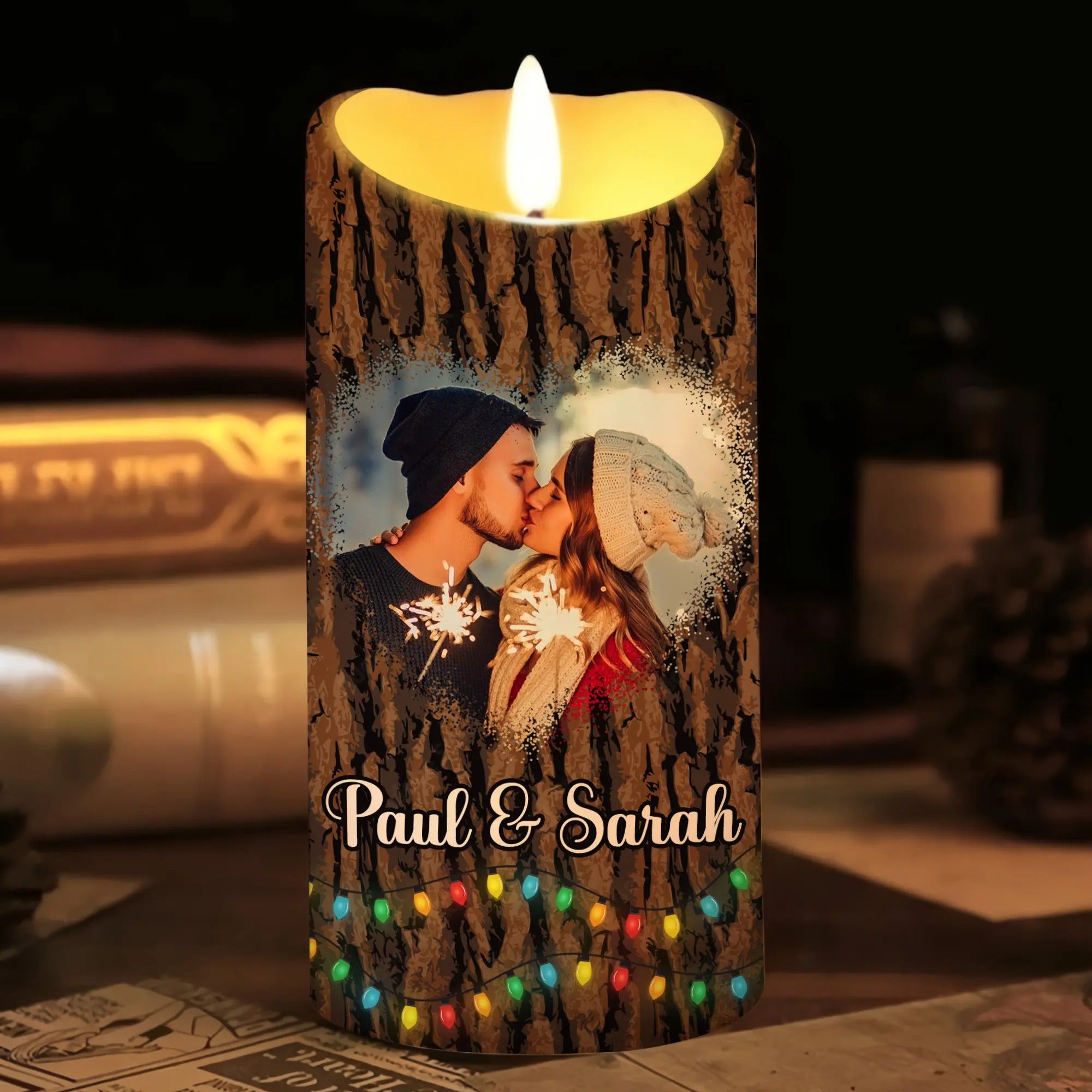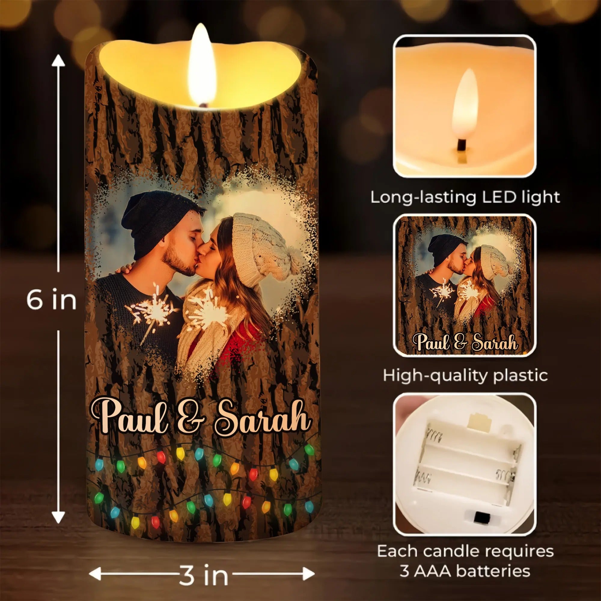 Celebrate your love and commitment with our LED Candle for Couples, the perfect anniversary gift for your partner or spouse. This unique candle is designed with a charming wood-grain texture and features the heartfelt message, 'I Wood Marry You All Over Again,' on the back, along with 'Happy Anniversary … year' to commemorate your special milestone. Customize it with your names and a personalized photo of you and your loved one, making it a truly one-of-a-kind keepsake. This LED candle offers a warm, flickering glow, ideal for creating a romantic ambiance and celebrating the love that continues to grow with each passing year.