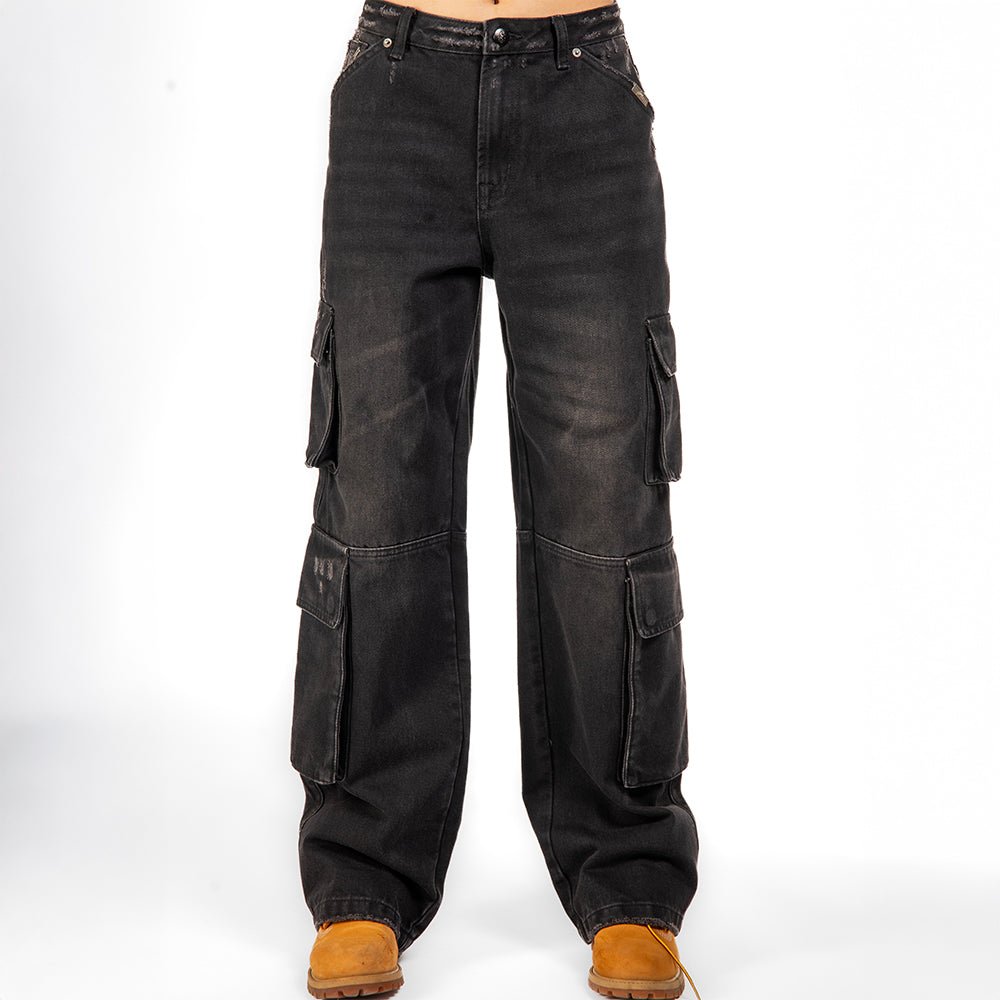 Distressed Cargo Denim with a baggy, over-ankle fit, crafted from 100% cotton denim in a natural black wash. Finished with custom metal rivets and button.
