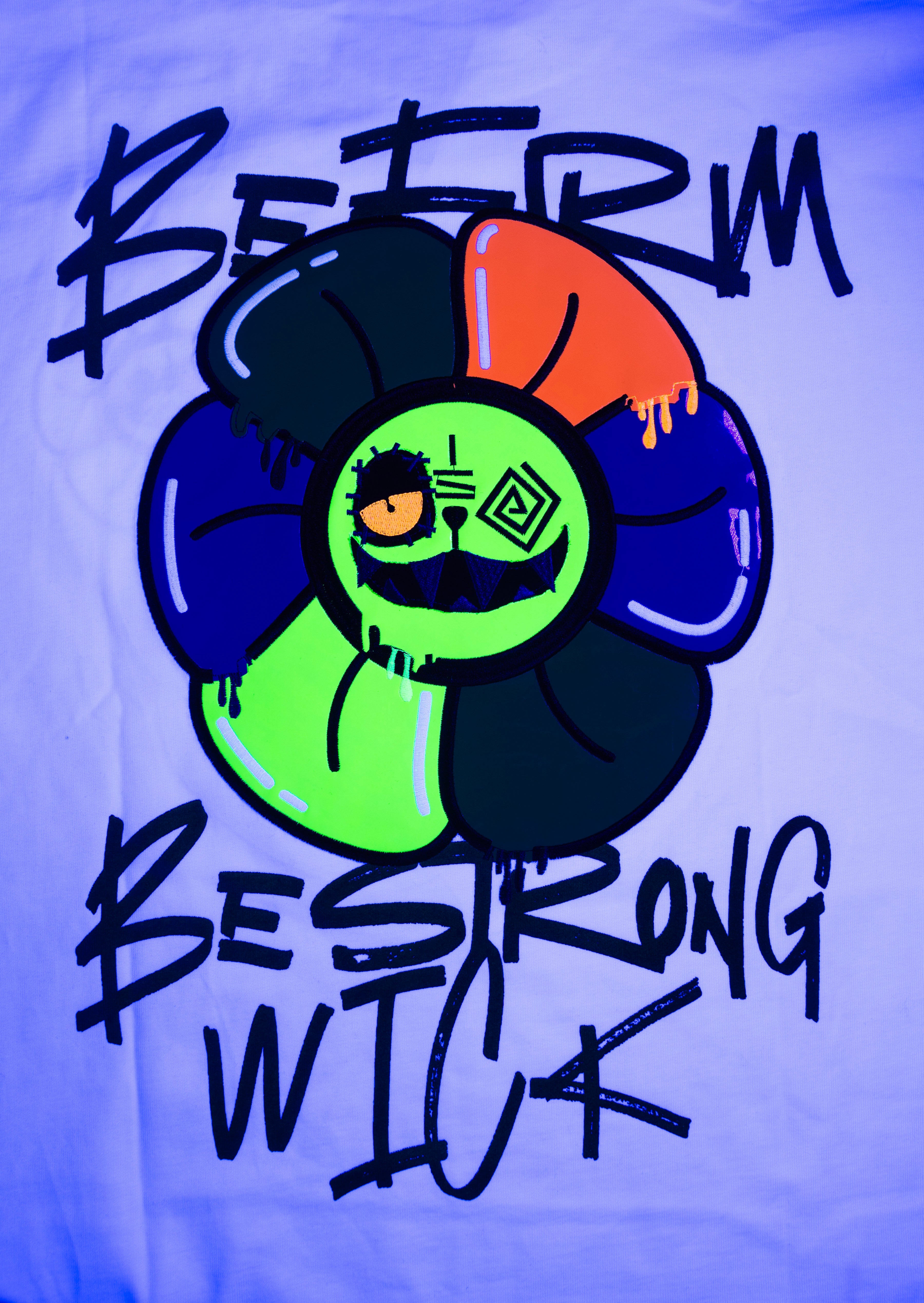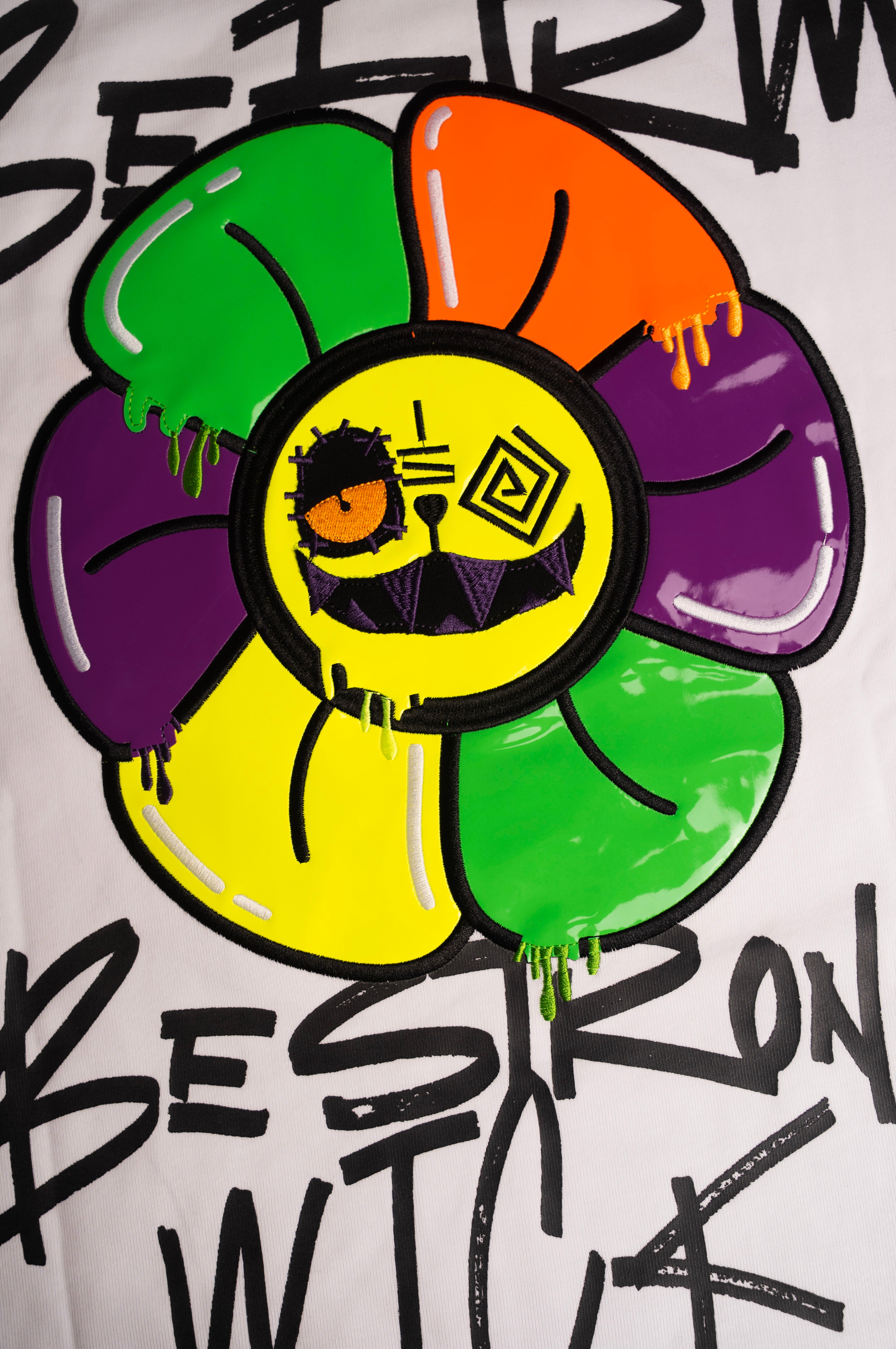 Color, chaos, and attitude — this tee brings it all. The Neon Ice Flower T-Shirt features a bold multicolor monster-flower graphic symbolizing strength through creativity. “Be Firm. Be Strong. WICK.” hits the back in graffiti lettering, turning streetwear into a statement.