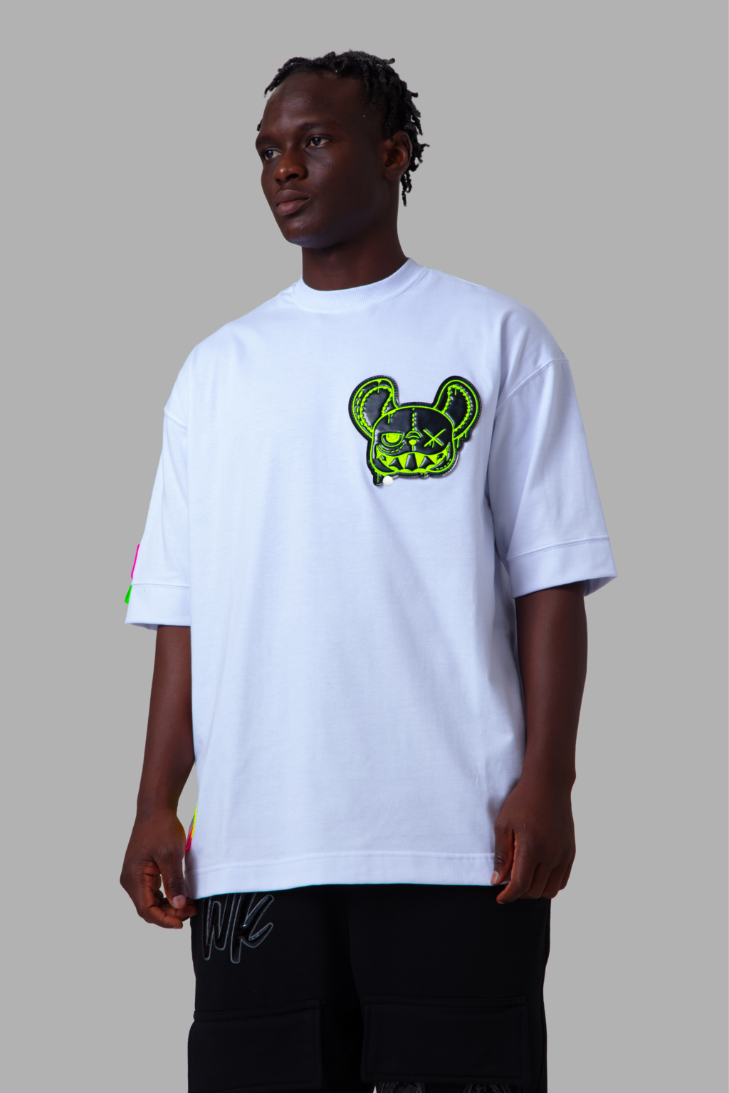 Boom! The Oversized NR Explosion White Pink Tee from Wick Monsters is here to make an explosive entrance. Featuring a neon-stitched monster bear face on the front and a splattered pink graffiti background