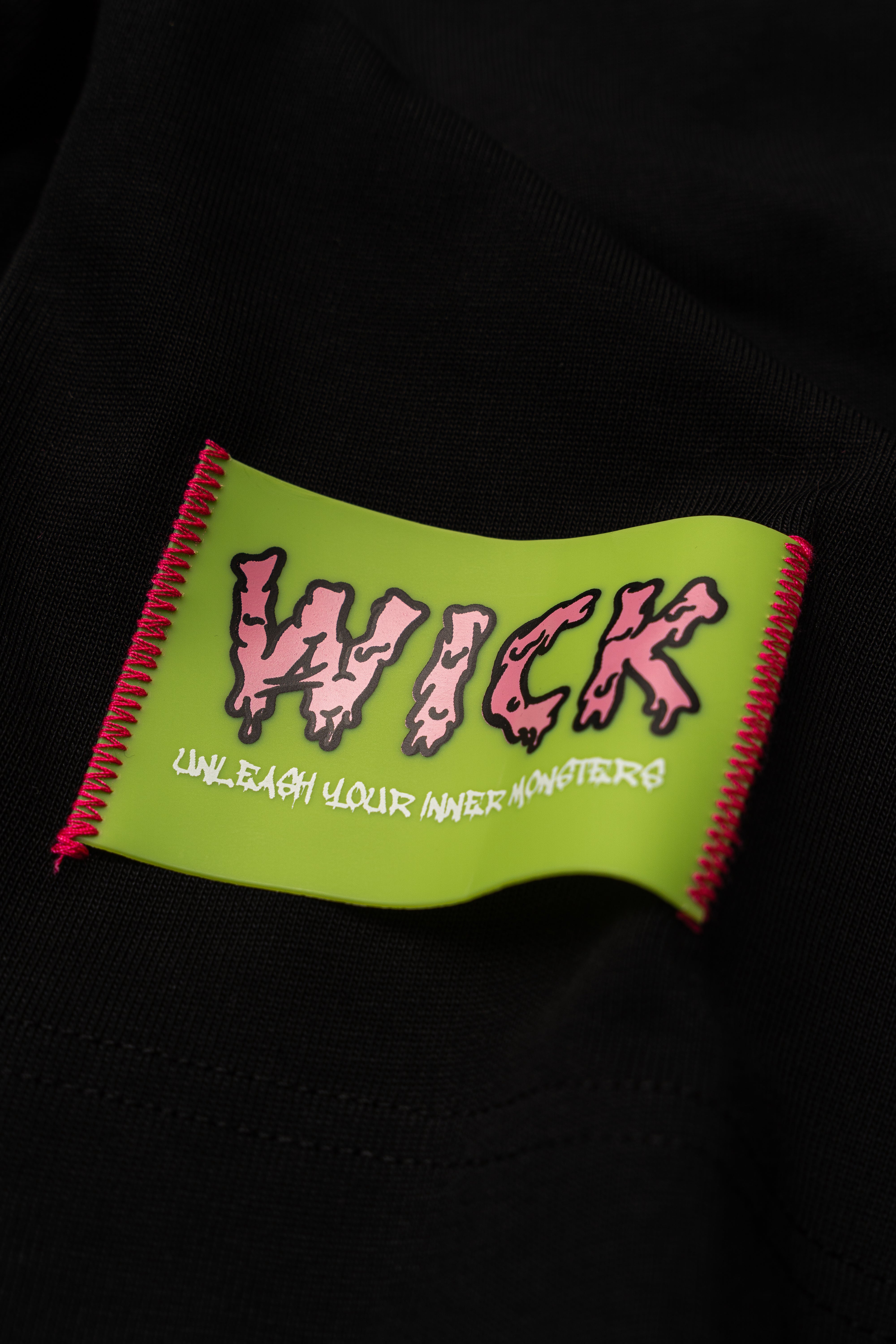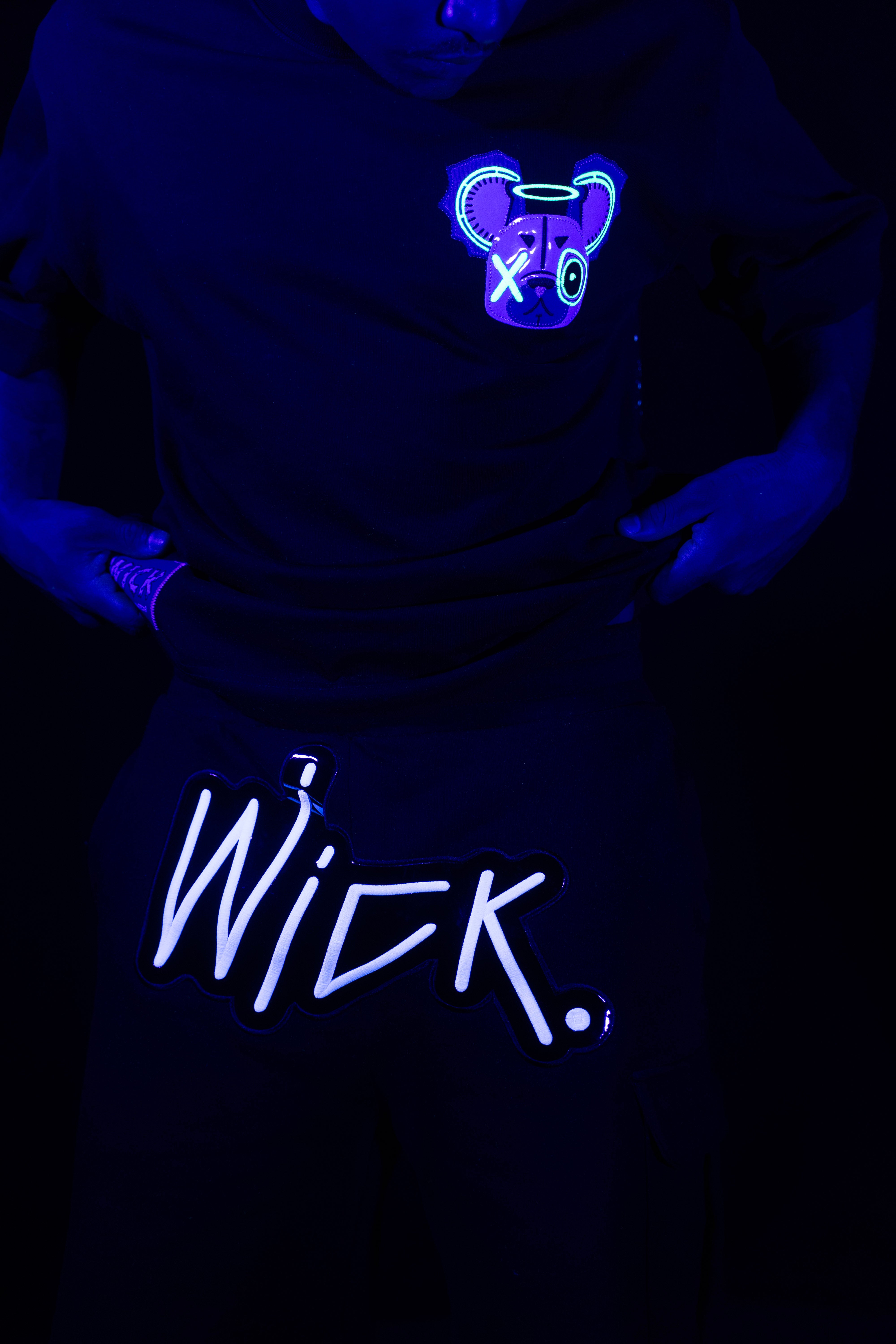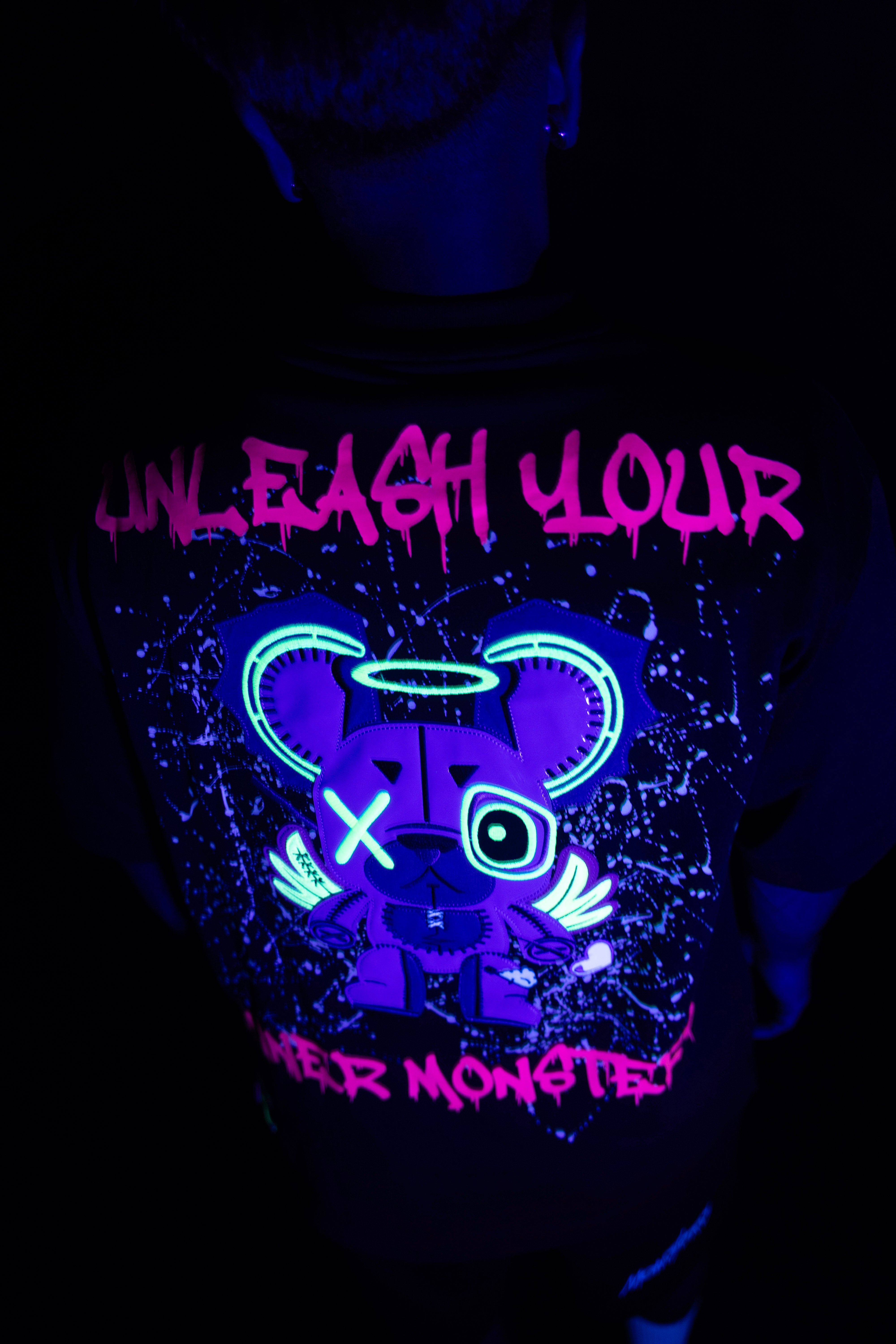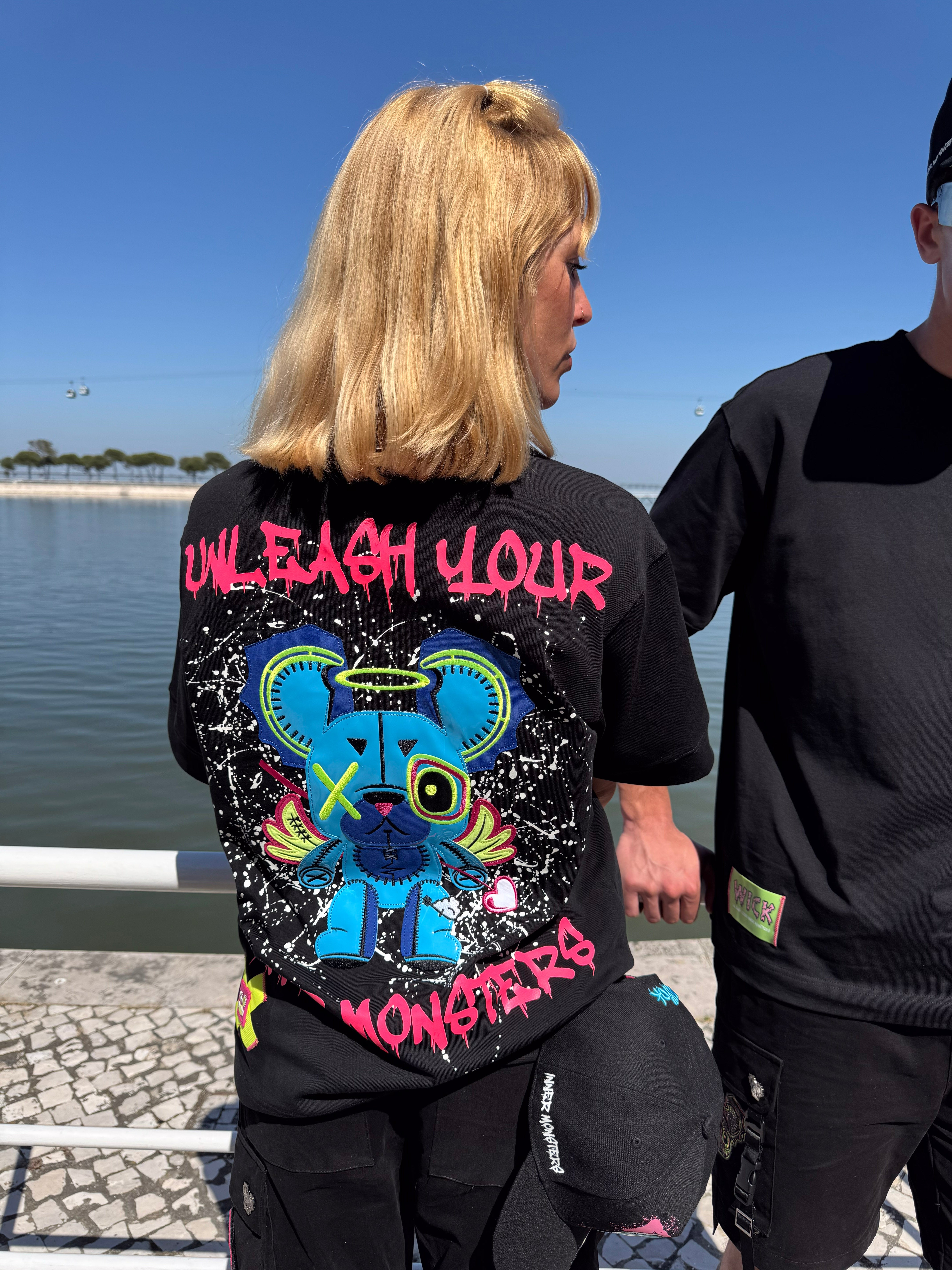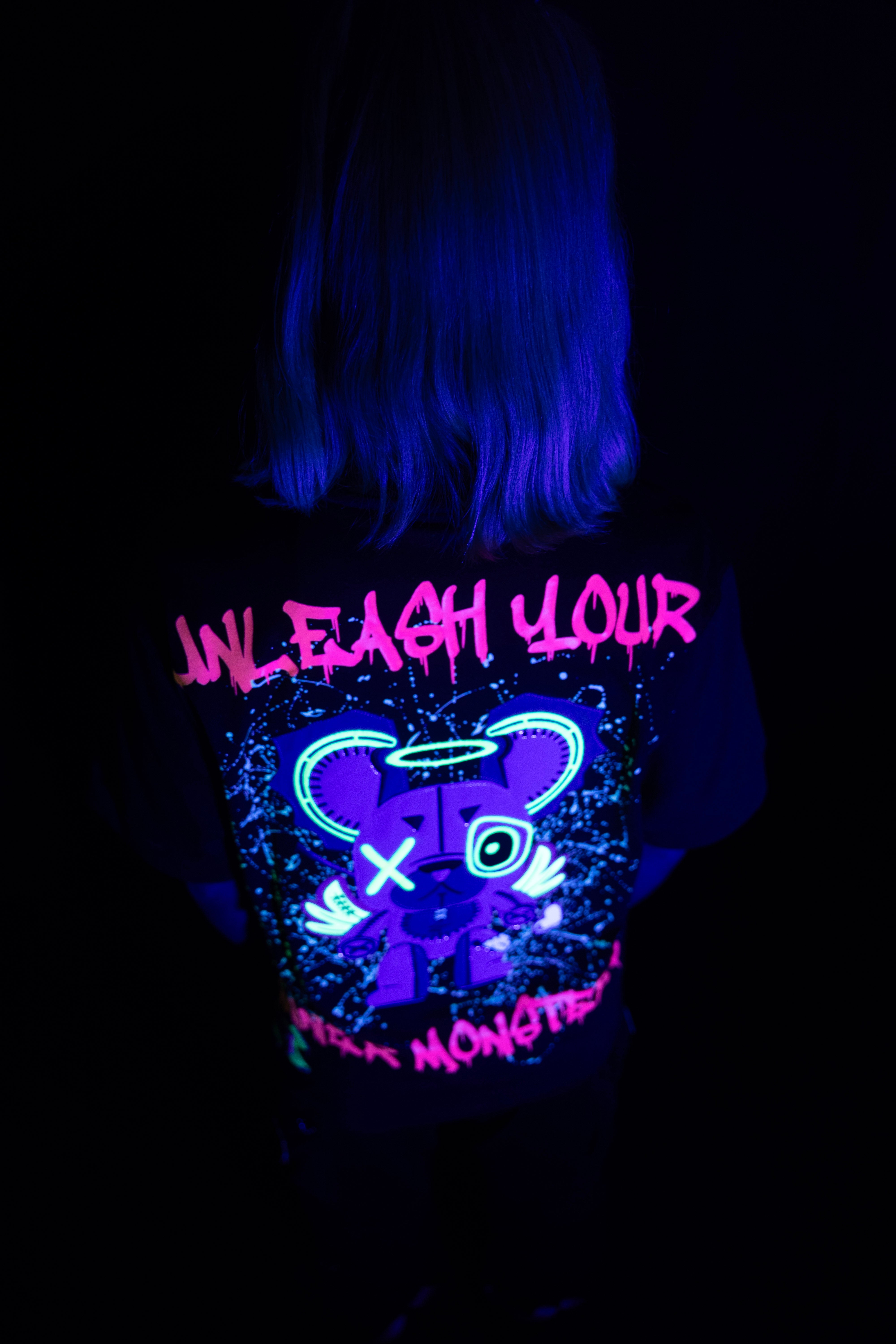 This oversized black t-shirt features a bold monster bear graphic with neon prints that react under UV light and glow in the dark. The front includes a small chest logo, while the back showcases a full-sized design with arrows and the phrase “WICK MONSTERS” in striking color. Made for those who want to stand out—day or night.