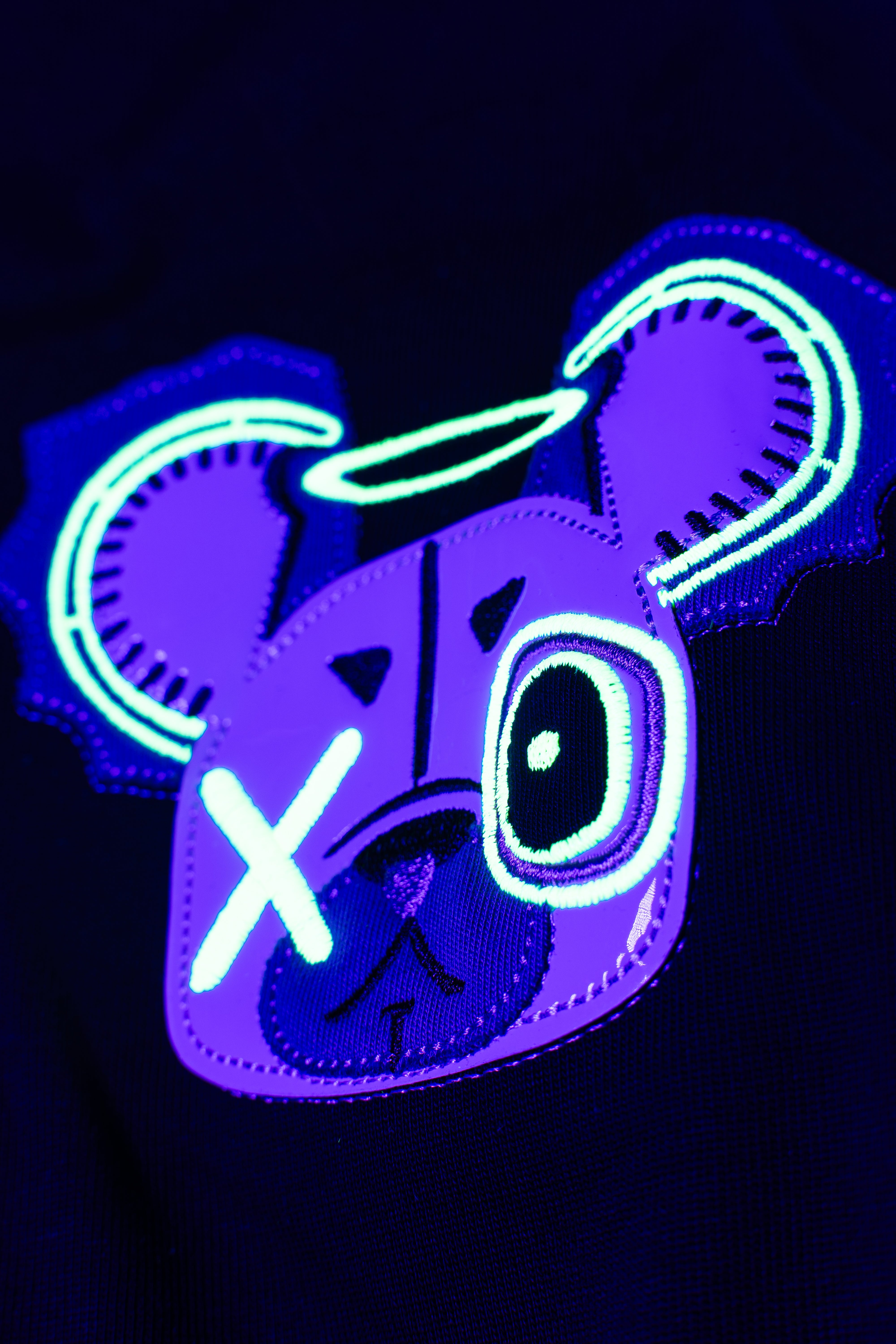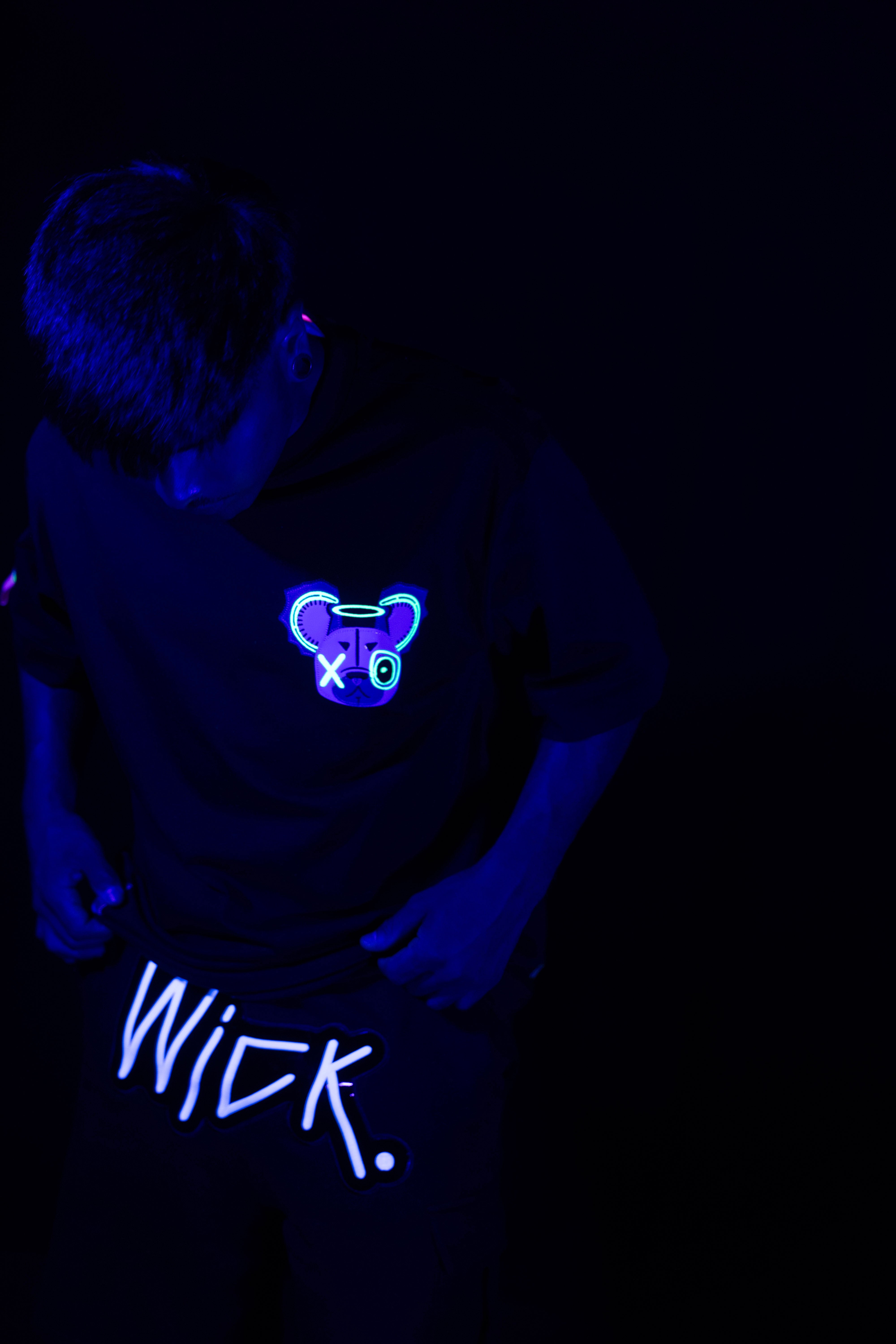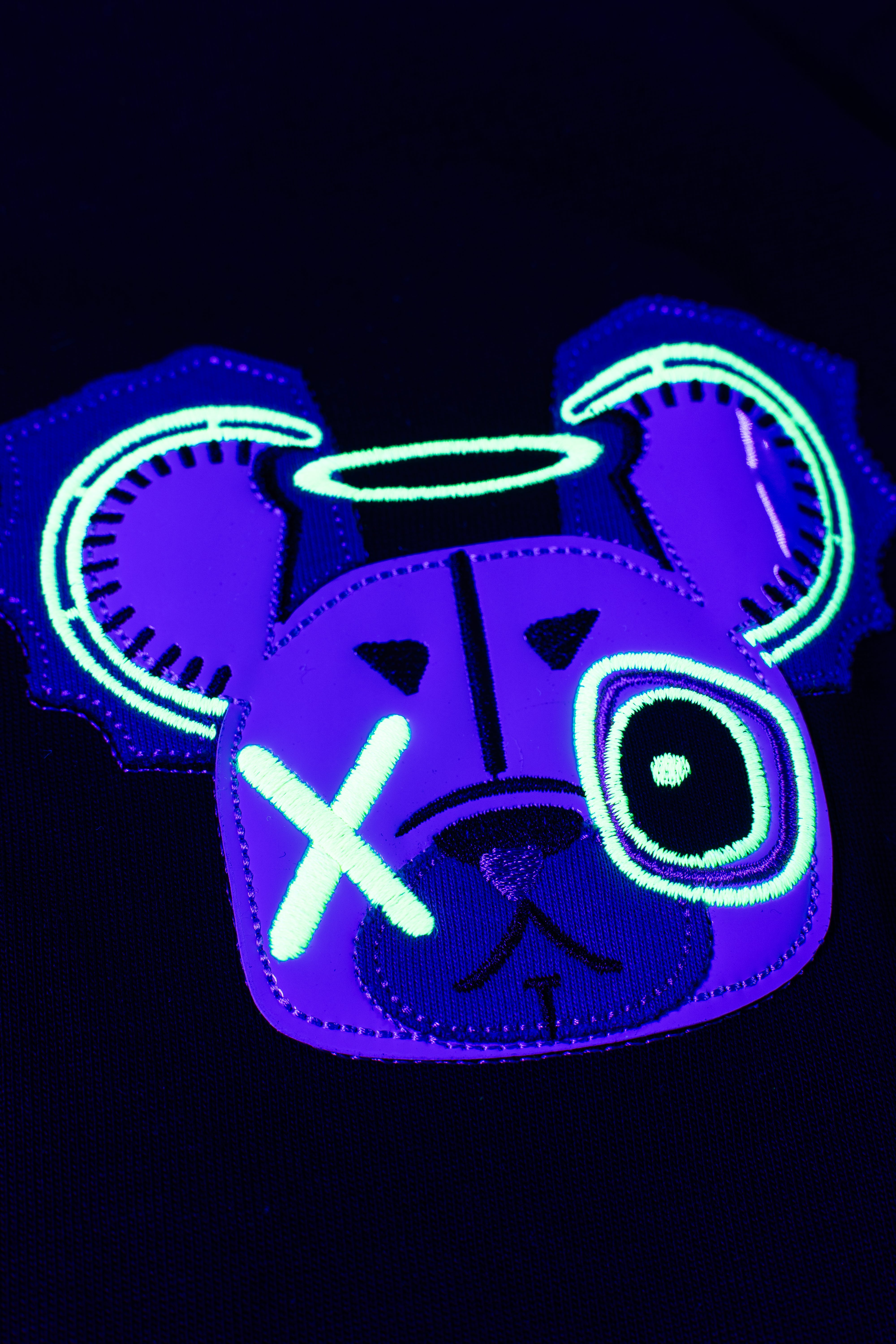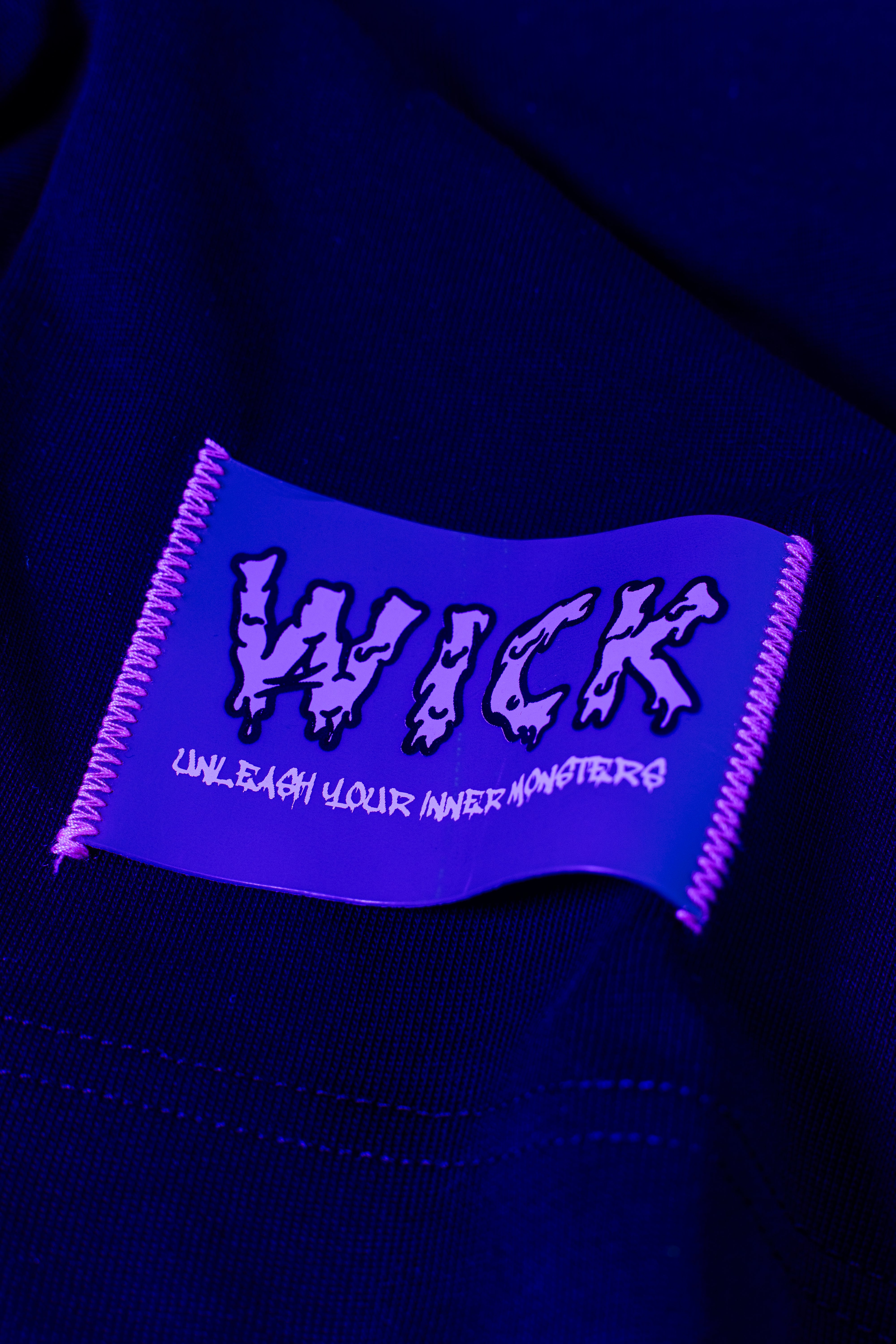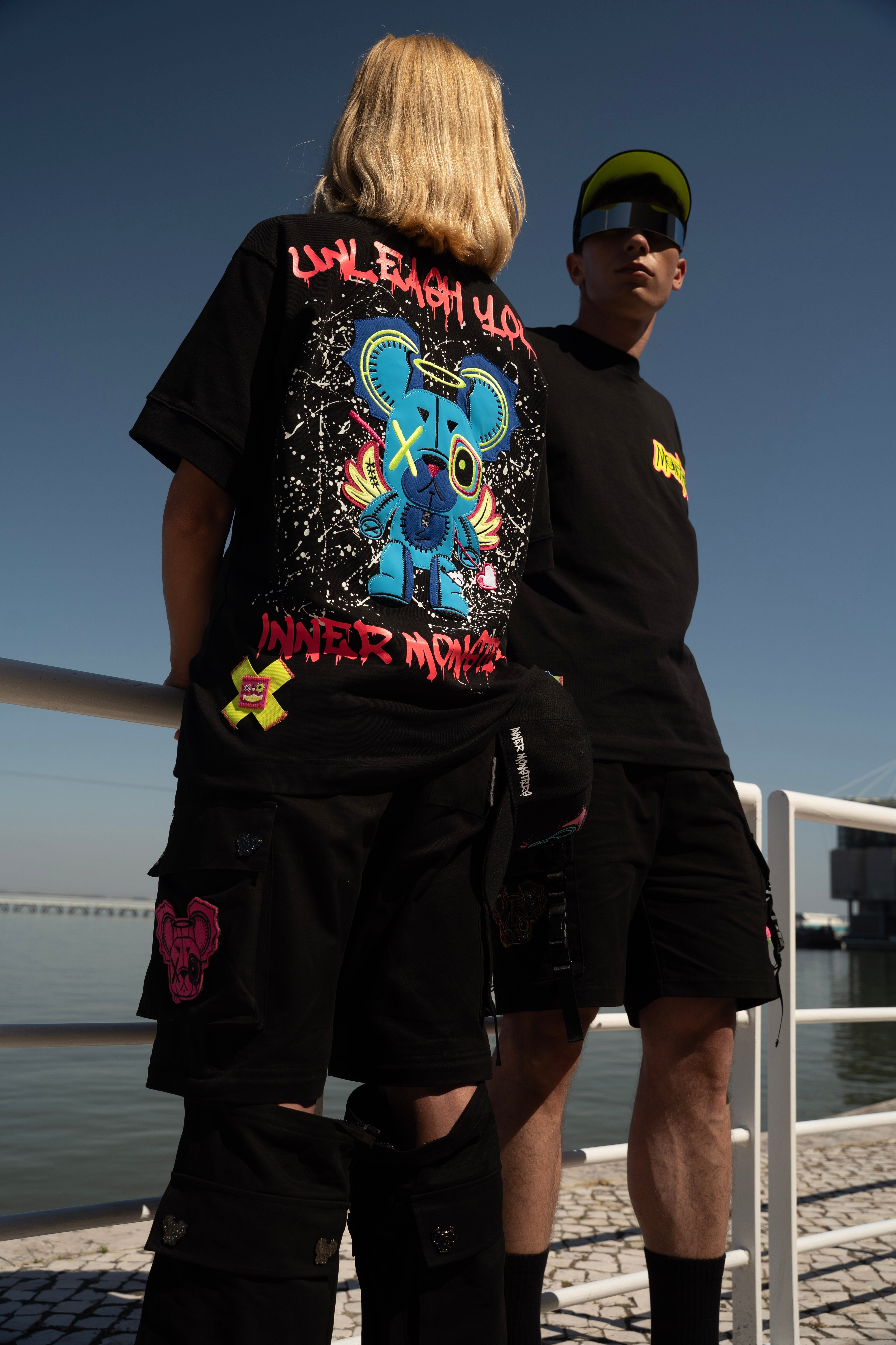 This oversized black t-shirt features a bold monster bear graphic with neon prints that react under UV light and glow in the dark. The front includes a small chest logo, while the back showcases a full-sized design with arrows and the phrase “WICK MONSTERS” in striking color. Made for those who want to stand out—day or night.