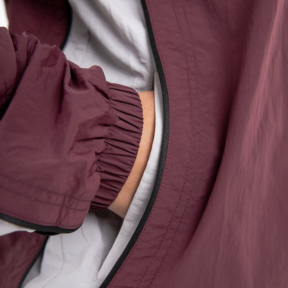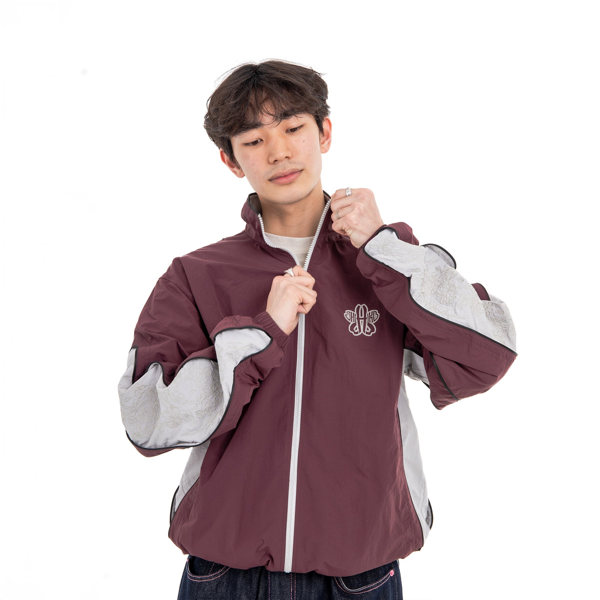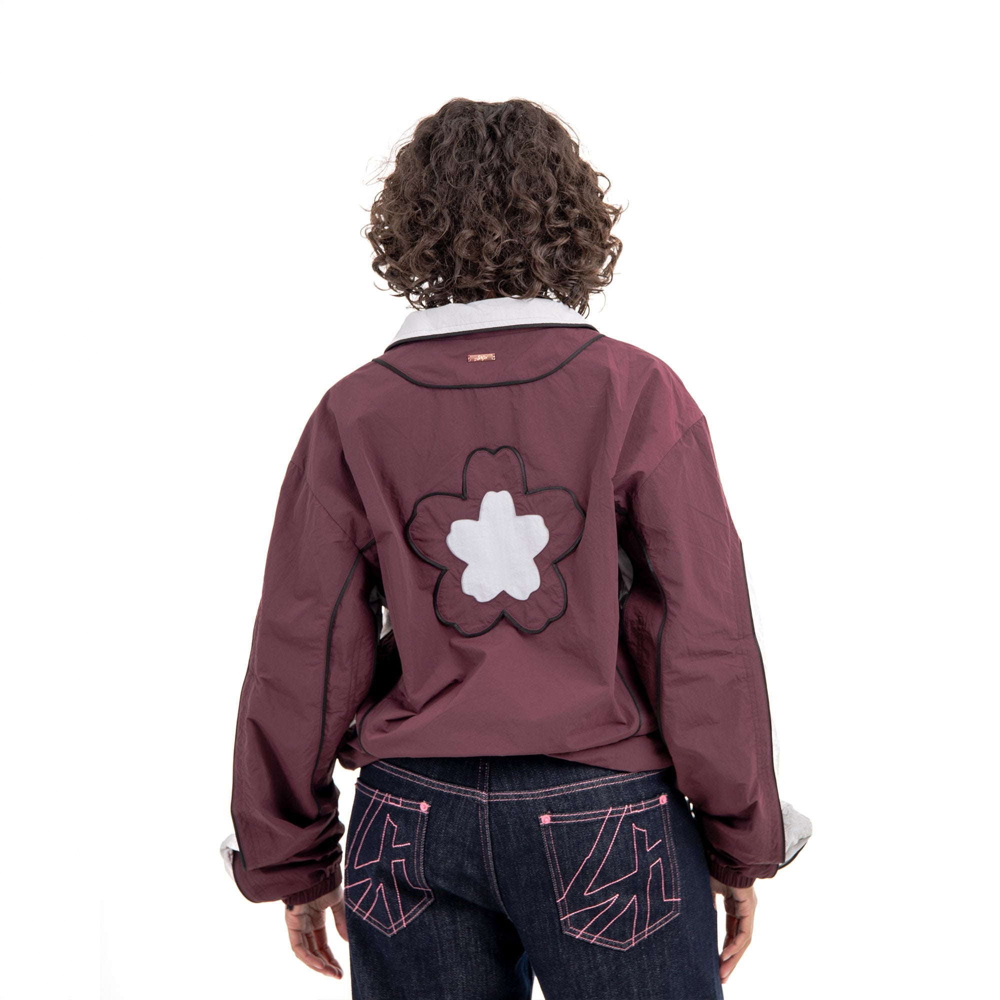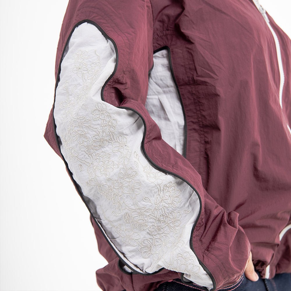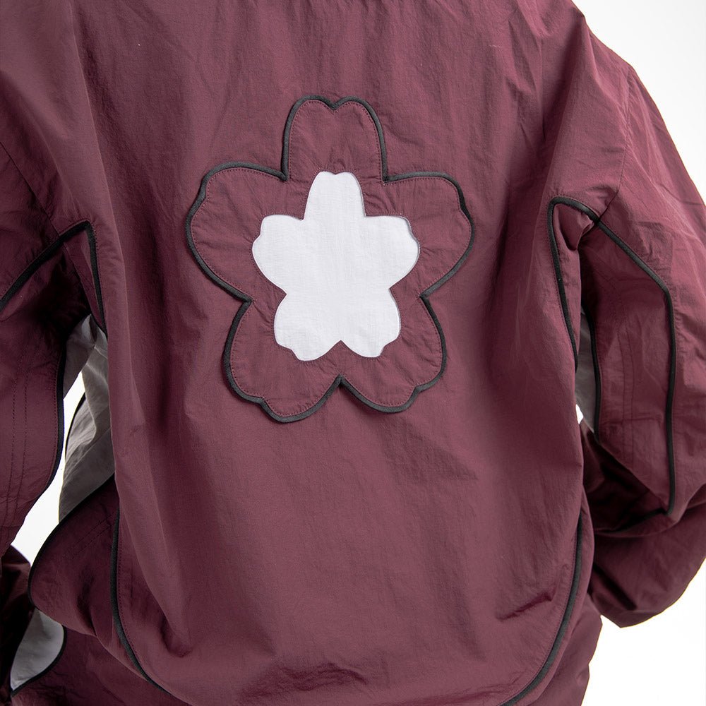 Inspired by cherry blossoms, the Sakura Windbreaker is a stylish and practical layer. Made from lightweight nylon with black and grey panels, it features cherry blossom embroidery on the arms and chest. It's finished with a unique cherry blossom zipper and a rose gold hem tag.