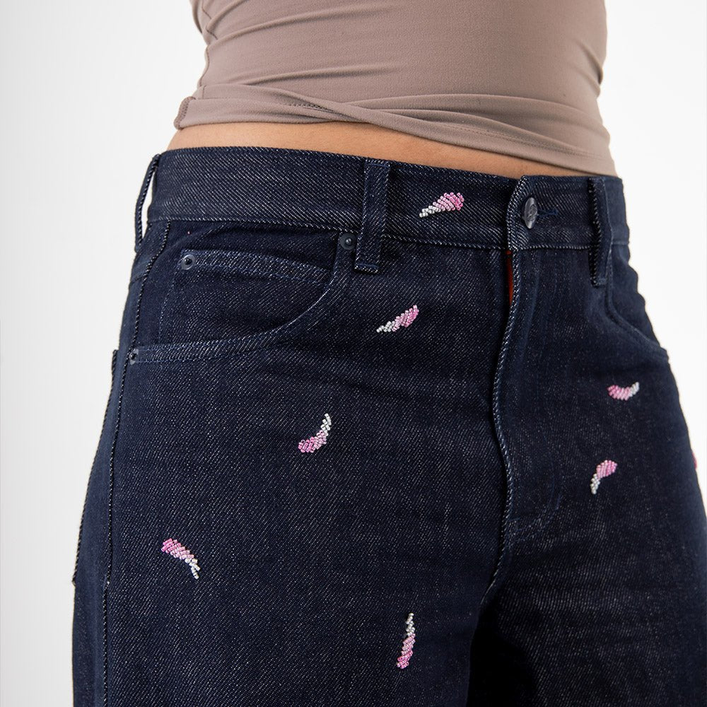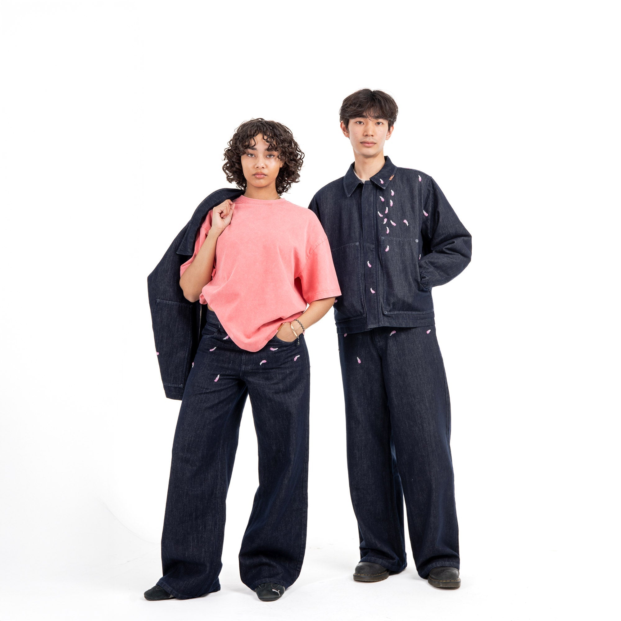Inspired by cherry blossoms, the Sakura Work Set Pants are both tough and artful. Made from 12-ounce cotton denim, they feature delicate cherry blossom petal beading. These pants have a custom inner fly with embroidery and durable oxidized metal hardware.