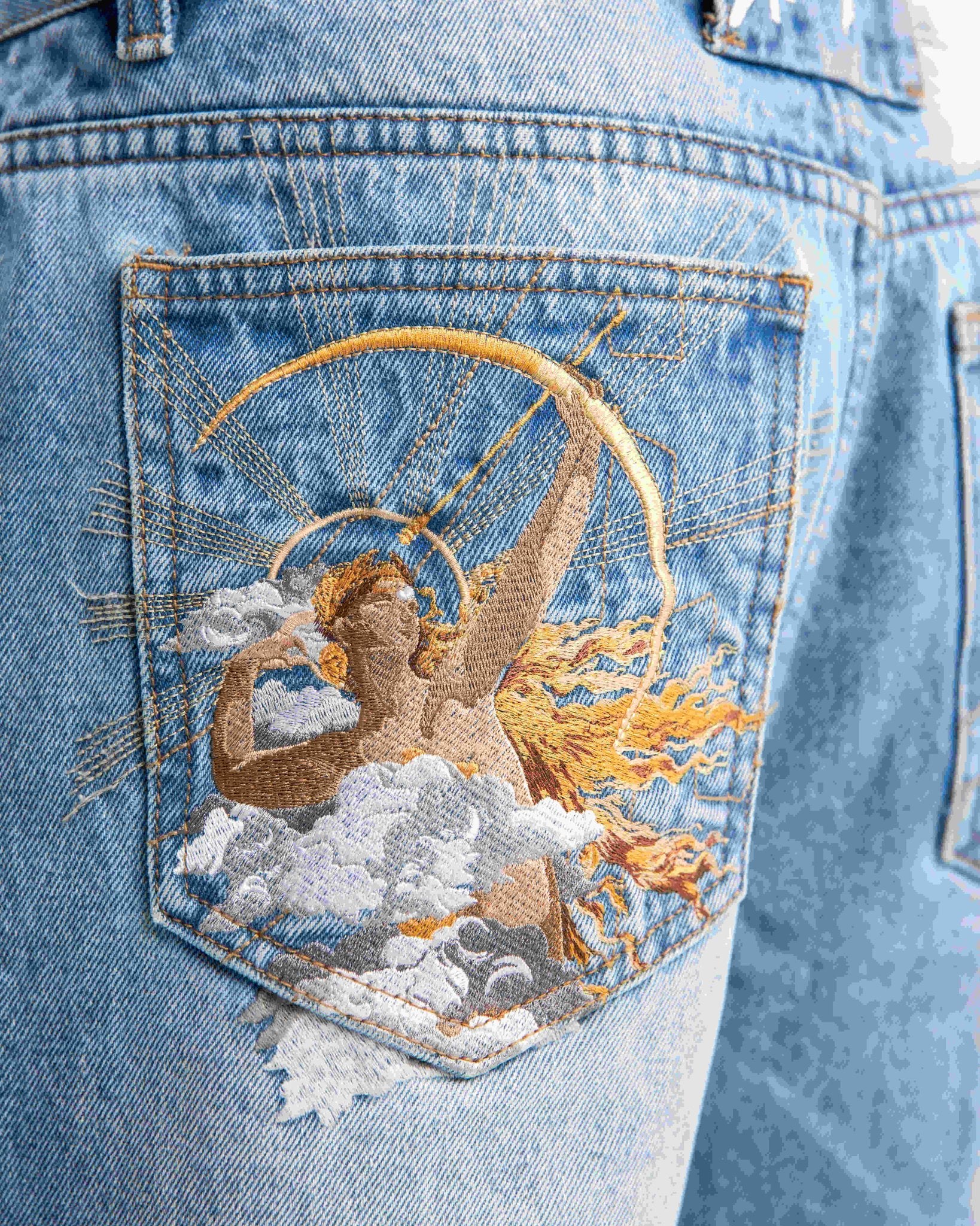 Starlit Huntress Jeans with a baggy, over-ankle fit, crafted from 100% cotton denim in a natural indigo light wash. These jeans feature custom satin embroidery of Artemis shooting an arrow on the back left pocket and screen prints down the back of both pant legs. Finished with custom dull silver metal rivets and buttons, these jeans pay homage to the Greek goddess of the hunt, blending mythological detail with modern craftsmanship.