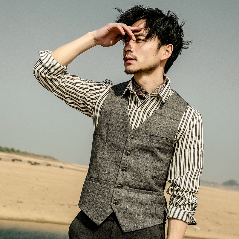 英倫商務復古格紋西裝馬甲,在磨毛的卡其中崁入不同的線條如同紳士複雜紊亂的思緒。